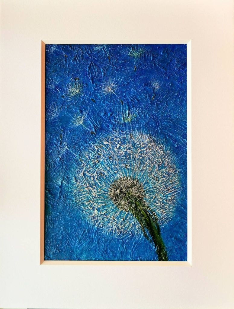浮かんだモチーフは「たんぽぽ」。Cさんご自身が、ものすごく輝いている方なので、その輝きを幸せの種に託しました。たくさんたくさん世界に種を飛ばし、その1つ1つは、それぞれの場所で花を咲かせます。Cさんの貢献はこれからどんどん広がっていくでしょう。